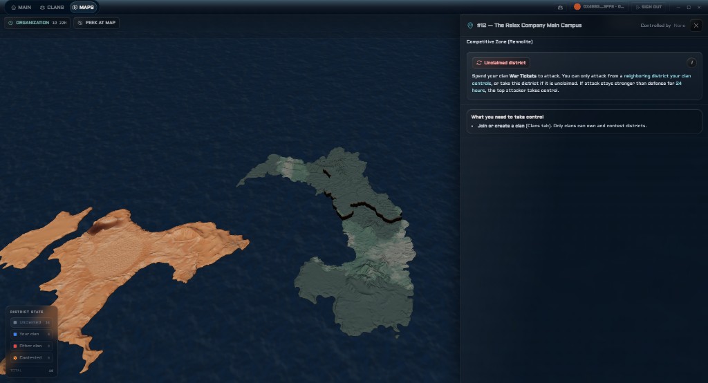This is the Maps system. Every district on Rennova's continents can be claimed, contested, or taken. What you see color-coded is real: your territory, rivals pushing against you, and unclaimed ground still up for grabs.